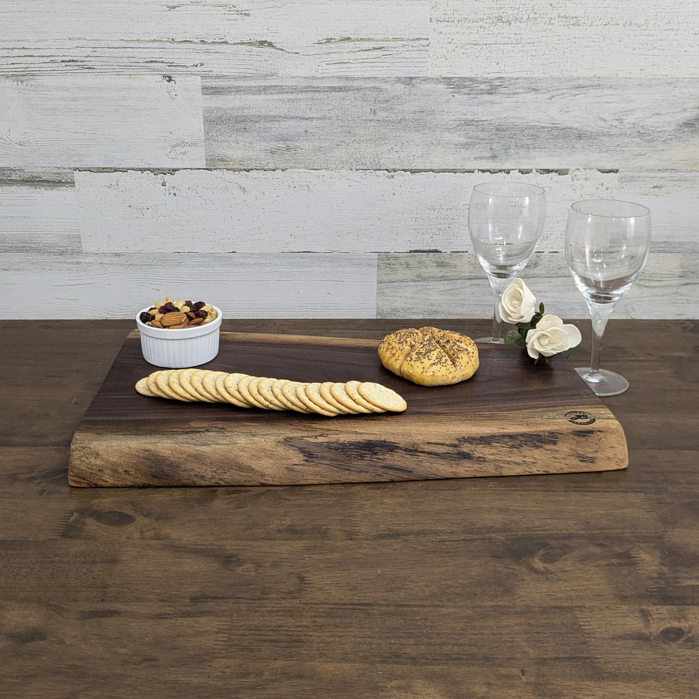 This beautiful black walnut charcuterie and cutting board is the perfect size not only for meal prep, but for serving as well. Great for small or large gatherings. When the party’s over, do not put this board away- it is gorgeous as a display piece for your home on its own!