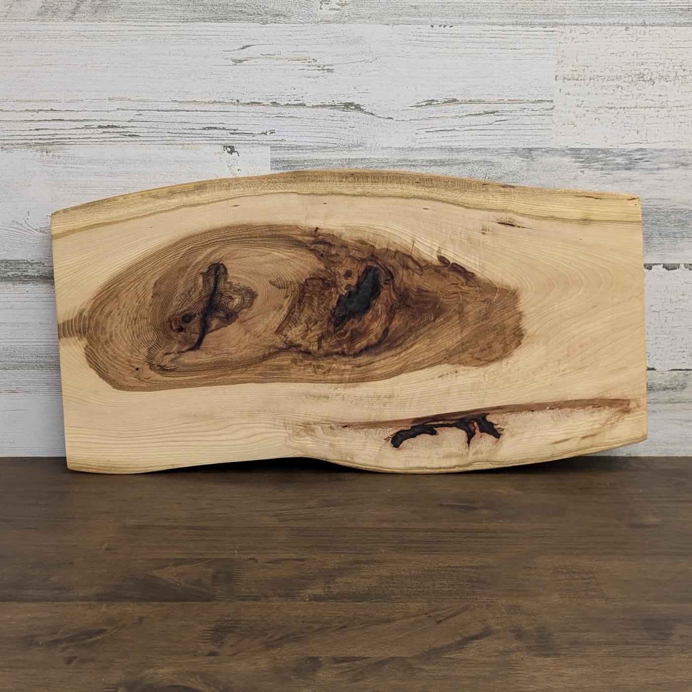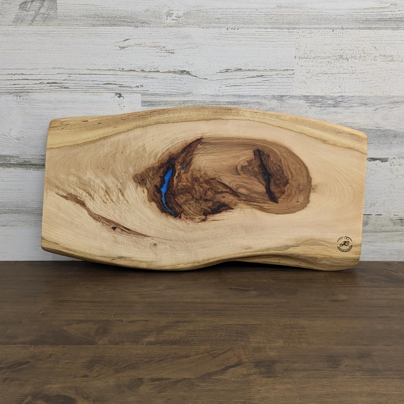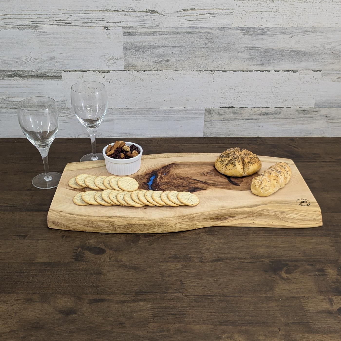 All of our charcuterie and cutting boards are dipped in food grade mineral oil and finished with our own combination of beeswax, carnauba wax, and food grade mineral oil. Due to the natural properties of wood, all edge grain cutting boards will leave knife marks. Since both sides of the boards have been finished, one side can be used for cutting and the other side for serving and display. Avoid cutting on the epoxy areas as this will dull your knife and leave marks in the epoxy.