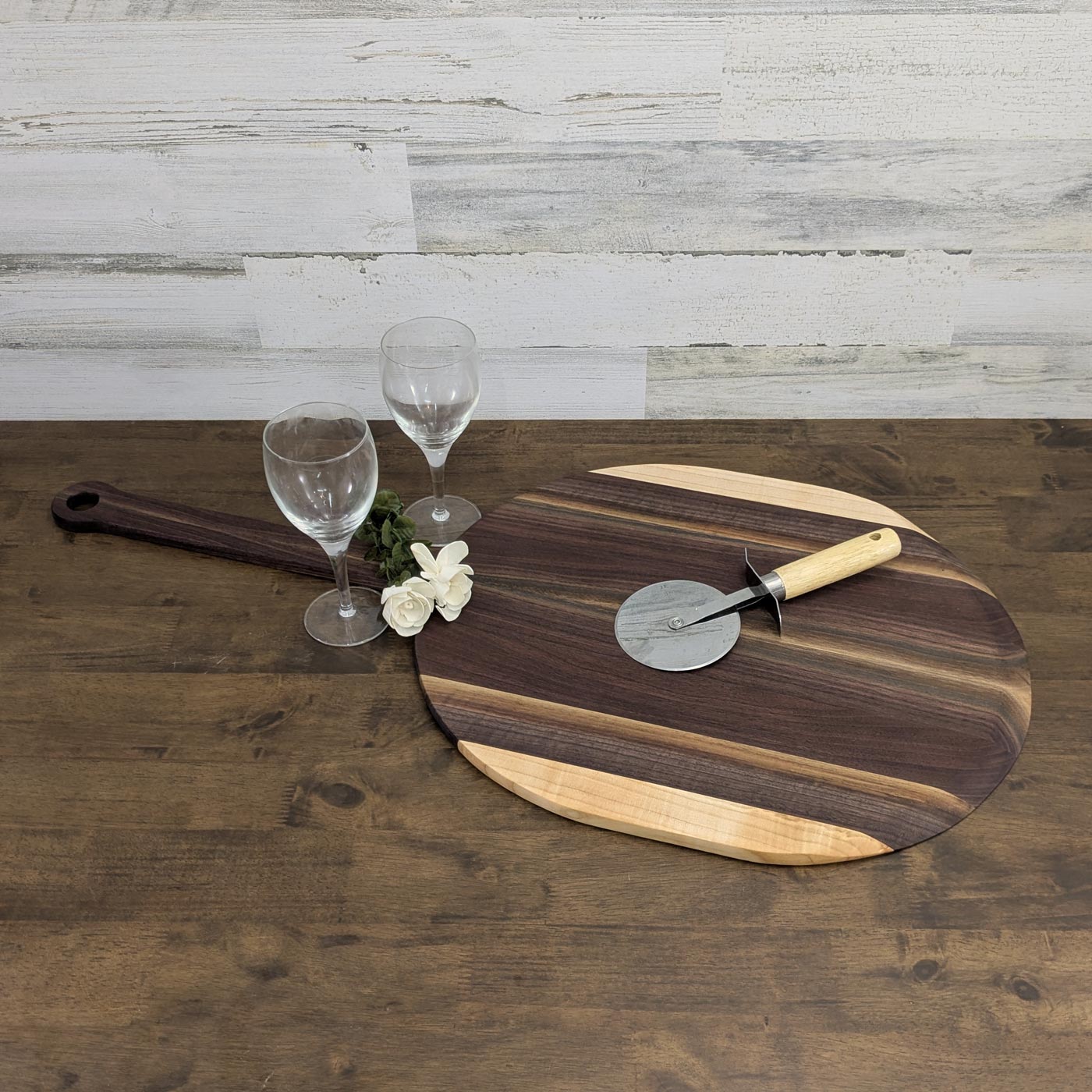 This beautiful large pizza paddle/peel is a wonderful addition for any kitchen! It is crafted from black walnut and maple and is perfect for any size of pizza.