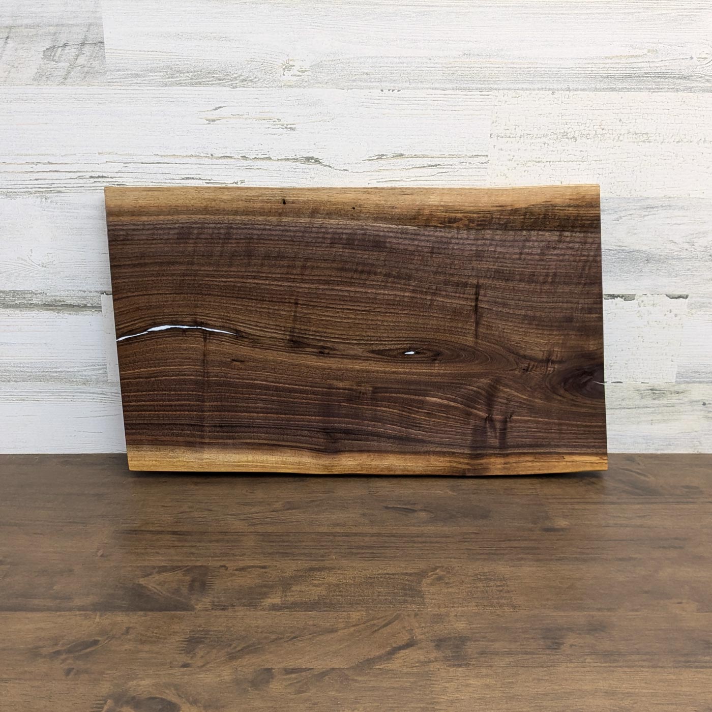 We dip all of our charcuterie and cutting boards in food grade mineral oil and finish with our own combination of beeswax, carnauba wax, and food grade mineral oil. Due to the natural properties of wood, all edge grain cutting boards will leave knife marks. Because we finish both sides of the boards, you may use one side for cutting and the other side for serving and display. Avoid cutting on the epoxy areas as this will dull your knife and leave marks in the epoxy.